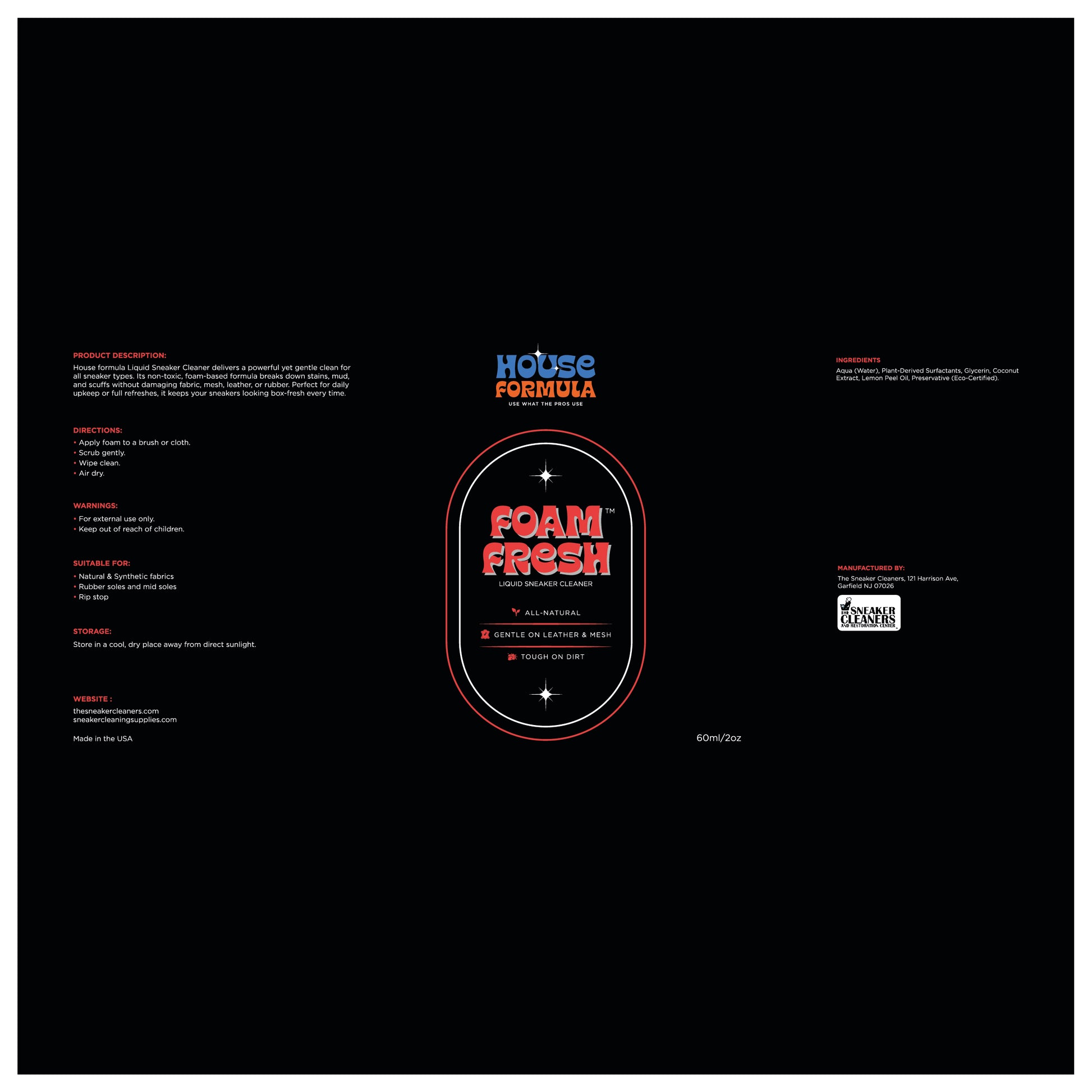 Bring your sneakers back to life with House Formula: Foam Fresh™, a powerful all-natural liquid sneaker cleaner engineered to break down dirt without damaging delicate materials.